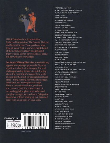 I Think Therefore I Am, Existentialism, Dialectical Materialism? The Socratic Method and Deconstruction? Sure, you know what they all mean. That is, you’ve certainly heard of them. But do you know enough about them to join a dinner party debate or dazzle the bar with your knowledge? 30-Second Philsophies takes a revolutionary approach to getting a grip on the 50 most significant schools of philosophy. The book challenges leading thinkers to quit fretting about the meaning of meaning for a while and explain the most complex philosophical ideas – using nothing more than two pages, 300 words, and a metaphorical image. Here, in one unique volume, you have the chance to pick the potted brains of our leading philosophers and understand complex concepts such as Kant’s Categorical Imperative without ending up in a darkened room with an ice pack on your head.