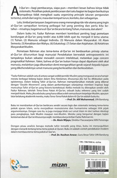 Al-Qur'an-bagi pembacanya, siapa pun-memberi kesan bahwa isinya tidak sistematis. Peralihan pokok pembicaraan dari satu bagian ke bagian berikutnya tampaknya tidak mengikuti suatu organizing principle (aturan pengurutan tertentu), entah dari segi isi, masa dan tempat turun, konteks, dan sebagainya.Lalu, timbul pertanyaan: bagaimana orang menangkap ide-ide utama yang ingin al-Qur'an sampaikan tentang pelbagai hal yang penting dan perlu kita ketahui-misalnya, bagaimana al-Qur'an bicara tentang Tuhan, manusia, dan alam?Dalam buku ini, Fazlur Rahman memberi kontribusi penting bagi pemetaan kandungan al-Qur'an yang terdiri atas 6.000 lebih ayat itu menjadi 8 tema utama: (1) Tuhan. (2) Manusia sebagai Individu. (3) Manusia dalam Masyarakat. (4) Alam Semesta. (5) Kenabian dan Wahyu. (6) Eskatologi. (7) Setan dan Kejahatan. (8) Kelahiran Masyarakat Muslim.Pemetaan Rahman atas tema-tema al-Qur'an ini berdasarkan prinsip utama: al-Qur'an diturunkan bagi manusia! Pendekatan berwatak antroposentris ini tampaknya bukan sekadar mewakili concern intelektual, melainkan juga concern pragmatikal Rahman. Yakni, bahwa al-Qur'an bukan hanya dapat dipahami oleh akal manusia, melainkan juga diturunkan demi mengarahkan gerak sejarah kepada tujuan yang dikehendakinya: umat manusia yang berkeadilan dan berkeadaban. Hampir seluruh karya Fazlur Rahman tentang Islam telah menjadi klasik karena dikerjakan dengan sangat metodologis. Rahman menguasai ilmu ulama yang paling alim dan juga mendalami karya-karya orientalis dengan sikap kritis dan apresiatif. Tema-Tema Pokok Al-Qur'an ini adalah saksi hidup dari penilaian saya ini.--Ahmad Syafii Maarif, murid Fazlur RahmanFazlur Rahman adalah satu di antara sangat sedikit pemikir Muslim yang menguasai secara hampir merata berbagai bidang kajian dalam Ilmu Keislaman, khususnya jika hal itu difokuskan pada epistemnya. Dalam bidang Tafsir al-Qur'an, Rahman memperkenalkan metode yang dikenal dengan "Double Movement", yang dalam perkembangan selanjutnya memberi inspirasi bagi munculnya Tafsir al-Qur'an yang historis-kontekstual. Ketika metode itu diterapkan sendiri oleh Fazlur Rahman, lahirlah Tema-Tema Pokok Al-Qur'an, sebuah buku referensi yang kini sudah menjadi klasik. Maka, jika ada buku yang harus dibaca oleh semua kaum terpelajar Muslim, apa pun latar belakang akademik mereka, maka Tema-Tema Pokok dalam Al-Qur'an adalah buku itu.--Prof. Dr. Afif Muhammad, UIN BandungBuku ini membiarkan al-Qur'an berbicara sendiri secara logis dan sistematis tentang tema-tema pokok ajaran Islam, serta menjadikan monoteisme dan humanisme sebagai titik pijak argumentasinya. Dengan cara itu, ia juga menjaga kitab suci umat Islam ini dari tarikan ideologi para pengkajinya, baik Muslim maupun non-Muslim. Mereka yang bergumul dengan kajian keislaman dan al-Qur'an khususnya wajib membaca karya brilian Fazlur Rahman ini.--Dr. Aksin Wijaya, Direktur Pascasarjana IAIN PonorogoDengan pisau analisis berupa metode tafsir tematik yang khas, buku ini menyuguhkan dengan menarik tentang tema-tema pokok al-Quran. Buku ini adalah contoh pendekatan modern dalam membaca tema-tema pokok al-Qur'an.--Prof. Dr. Rosihon Anwar, Guru Besar Tafsir UIN BandungSekitar 30 tahun yang lalu, saya sangat terkesan dengan apa yang disampaikan oleh Prof. Fazlur Rahman di kelas beliau, di kantornya sendiri Neareastern Languages and Civilizations, University of Chicago. Kelas tersebut diberi nama Reading in the Quran. Uraian-uraian beliau yang sebagian besar diambil dari tema-tema yang ada dalam buku ini, cukup berbeda dari penyajian al-Qur'an yang lain-lain. Dengan metode tematik, yang pada saat itu belum begitu banyak dilakukan, dan latar belakang filsafat-teologis yang kental, Fazlur Rahman memberikan penafsiran yang rasional-filosofis, sekalipun beliau sendiri menginginkan karya ini bisa "menyingkap apa yang sesungguhnya yang hendak dikatakan al-Qur'an tentang Tuhan, manusia, dan masyarakat."Nuansa logis, teologis, dan filosofis tersebut, misalnya, bisa dilihat dari pernyataannya bahwa "alam berjalan dengan hukumnya sendiri yang diletakkan secara inheren oleh Tuhan dan karena itu bersifat otonom." Ini tentunya lebih mencerminkan pandangan Mu'tazilah dan filosof ketimbang pandangan mayoritas ulama Asy'ariyah, termasuk al-Ghazali yang menentang realitas kausalitas.Membaca kembali buku Tema-Tema Pokok Al-Qur'an, serasa memutar balik apa yang saya alami dan rasakan di kelas Prof. Fazlur Rahman, seakan-akan kelas beliau hidup kembali. Sungguh karya ini, apabila ditekuni, merupakan sebuah karya yang sistematis, rasional, sangat menarik, meski dalam beberapa hal agak kontroversial.Buku ini sudah menjadi keharusan bagi siapa saja yang ingin mengetahui secara mendalam apa pandangan al-Qur'an tentang Tuhan, manusia, dan alam. Oleh karena itu, buku ini harus menjadi rujukan utama semua kalangan: akademisi, mahasiswa, dan kaum intelektual Islam pada umumnya.--Prof. Dr. Mulyadhi Kartanegara, Pakar filsafat dan spiritualitas IslamAl-Qur'an mengandung ajaran pokok dan ajaran cabang. Yang pokok bersifat tetap tak berubah. Sementara yang cabang terbuka kemungkinan untuk terus ditafsirkan sesuai dengan perkembangan peradaban umat manusia. Melalui buku ini, Fazlur Rahman bukan hanya menyuguhkan mana ayat yang pokok dan mana yang cabang, melainkan juga bagaimana membaca dua jenis ayat itu secara konseptual.--Dr. Abdul Moqsith Ghazali Lembaga Bahtsul Masail PBNU, Dosen UIN Syarif Hidayatullah JakartaDari 6.000 lebih ayat al-Qur'an, orang tentu bisa memetakan tema-tema tertentu, dengan berbagai pendekatan-dan hasilnya tentu berlainan, baik dari segi nama dan jumlah tema, maupun paradigma yang dipakai. Orang bisa saja memetakan kandungan al-Qur'an itu, misalnya, dengan pendekatan Rukun Iman dan Rukun Islam; trilogi Islam-Iman-Ihsan; trilogi syariah-hakikat-ma'rifat; kategori ayat muhkamat-mutasyabihat; tipologi ayat-ayat Makiyah?Madaniyah; trilogi Tuhan-alam-manusia; disiplin keilmuan tauhid, fiqih (syariat), sirah, ibadah, muamalah, dll. Apa pun p