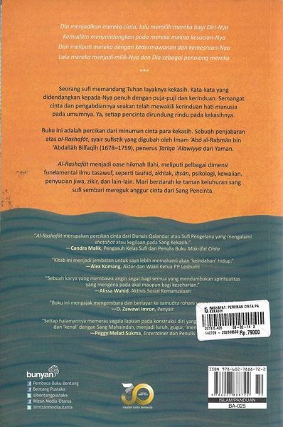 Seorang sufi dalam buku ini memandang Tuhan layaknya kekasih. Kata-kata yang didendangkan kepada-Nya penuh dengan puja-puji dan kerinduan. Semangat cinta dan pengabdiannya seakan telah mewakili kerinduan hati manusia pada umumnya. Ya, setiap pencinta dirundung rindu pada kekasihnya.Buku ini adalah percikan dari minuman cinta para kekasih. Sebuah penjabaran atas al-Rashaf?t, syair sufistik yang digubah oleh Imam Abd al-Rahm?n b. Abdall?h Bilfaq?h (1678-1759), penerus ?ar?qa ?Alawiyya dari Yaman.Al-Rashaf?t menjadi oase hikmah Ilahi, meliputi pelbagai dimensi fundamental ilmu tasawuf, seperti tauhid, akhlak, ihsan, psikologi, kewalian, penyucian jiwa, zikir, dll. Mari berziarah ke taman keluhuran sang sufi sembari mereguk anggur cinta dari Sang Pencinta. [Mizan, Bunyan, Agama Isalam, Sufi]