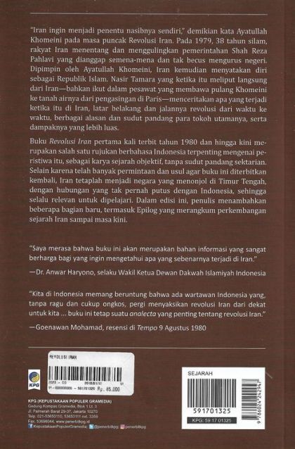 Sinopsis: “Iran ingin menjadi penentu nasibnya sendiri,” demikian kata Ayatullah Khomeini pada masa puncak Revolusi Iran. Pada 1979, 38 tahun silam, rakyat Iran menentang dan menggulingkan pemerintahan Shah Reza Pahlavi yang dianggap semena-mena dan tak becus mengurus negeri. Dipimpin oleh Ayatullah Khomeini, Iran kemudian menyatakan diri sebagai Republik Islam. Nasir Tamara yang ketika itu meliput langsung dari Iran—bahkan ikut dalam pesawat yang membawa pulang Khomeini ke tanah airnya dari pengasingan di Paris—menceritakan apa yang terjadi ketika itu di Iran, latar belakang dan jalannya revolusi dari waktu ke waktu, berbagai alasan dan sudut pandang para tokoh utamanya, serta dampaknya yang lebih luas. Buku Revolusi Iran pertama kali terbit tahun 1980 dan hingga kini merupakan salah satu rujukan berbahasa Indonesia terpenting mengenai peris tiwa itu, sebagai karya sejarah objektif, tanpa sudut pandang sektarian. Selain karena telah banyak permintaan dan usul agar buku ini diterbitkan kembali, Iran tetaplah menjadi negara yang menonjol di Timur Tengah, dengan hubungan yang tak pernah putus dengan Indonesia, sehingga selalu relevan untuk dipelajari. Dalam edisi ini, penulis menambahkan beberapa bagian baru, termasuk Epilog yang merangkum perkembangan sejarah Iran sampai masa kini. “Saya merasa bahwa buku ini akan merupakan bahan informasi yang sangat berharga bagi yang ingin menge tahui apa yang sebenarnya terjadi di Iran.” —Dr. Anwar Haryono, selaku Wakil Ketua Dewan Dakwah Islamiyah Indonesia “Kita di Indonesia memang beruntung bahwa ada wartawan Indonesia yang, tanpa ragu dan cukup ongkos, pergi menyaksikan revolusi Iran dari dekat untuk kita ... buku ini tetap suatu analecta yang penting tentang revolusi Iran.” —Goenawan Mohamad, resensi di Tempo 9 Agustus 1980