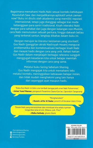 Bagaimana memahami Hadis Nabi sesuai konteks kehidupan Rasulullah Saw. dan menjadikannya aplikatif untuk zaman now? Buku ini ditulis oleh akademisi yang memiliki reputasi internasional, tetapi juga dianggap sebagai kiai muda kebanggaan para santri tradisional. Kisah interaksi Nabi dengan para sahabat dan juga dengan kalangan non-Muslim, cara Nabi memutuskan sebuah perkara, hingga dakwah beliau yang terkenal santun—lengkap dibahas dalam buku ini. Dengan merujuk ke literatur keislaman yang otoritatif, Gus Nadir (panggilan akrab Nadirsyah Hosen) mengurai problematika dan kontekstualisasi berbagai kisah Nabi dan riwayat hadis dengan cara yang unik. Kehati-hatian Gus Nadir dalam menjelajah berbagai referensi sungguh menggugah kesadaran kita untuk belajar memilah informasi dengan cara yang sama. Melalui buku Saring Sebelum Sharing, Gus Nadir mengajak kita untuk memahami teks melalui konteks, meninggalkan kebiasaan belajar instan, dan tidak mudah menghakimi yang lain hanya dari sepenggal ayat maupun hadis.