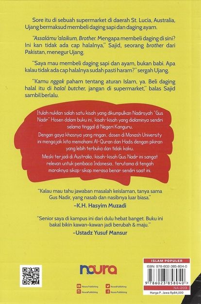 Sore itu di sebuah supermarket di daerah St. Lucia, Australia, Ujang bermaksud membeli daging sapi dan daging ayam.“Assalâmu ‘alaikum, Brother. Mengapa membeli daging di sini? Ini kan tidak ada cap halalnya,” Sajid, seorang brother dari Pakistan, menegur Ujang.“Saya mau membeli daging sapi dan ayam, bukan babi. Apa kalau tidak ada cap halalnya sudah pasti haram?” sergah Ujang.“Kamu nggak paham tentang aturan Islam, ya. Beli daging halal itu di halal butcher, jangan di supermarket,” balas Sajid sambil berlalu.***Itulah nukilan salah satu kisah yang dikumpulkan Nadirsyah “Gus Nadir” Hosen dalam buku ini, kisah-kisah yang dialaminya sendiri selama tinggal di Negeri Kanguru.Dengan gaya khasnya yang ringan, dosen di Monash University ini mengajak kita memahami Al-Quran dan Hadis dengan pikiran yang lebih terbuka dan tidak kaku.Meski terjadi di Australia, kisah-kisah Gus Nadir ini sangat relevan untuk pembaca Indonesia, terutama di tengah maraknya sikap-sikap merasa benar sendiri saat ini.[Mizan, Noura Books, Nourabooks, Religi, Islam, Indonesia]