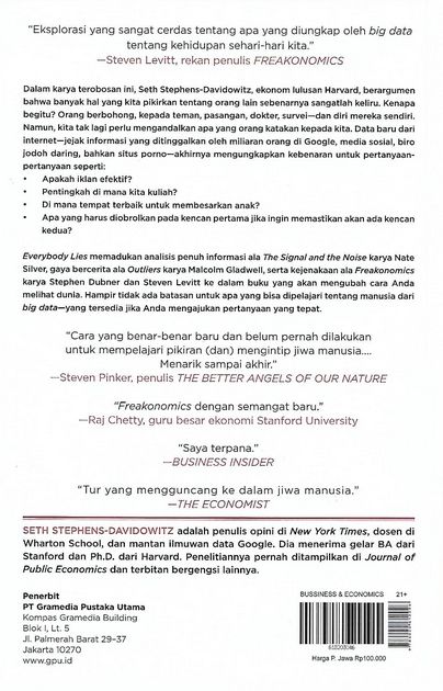 "Eksplorasi yang sangat cerdas tentang apa yang diungkap oleh big data tentang kehidupan sehari-hari kita.” —Steven Levitt, rekan penulis FREAKONOMICS Dalam karya terobosan ini, Seth Stephens-Davidowitz, ekonom lulusan Harvard, berargumen bahwa banyak hal yang kita pikirkan tentang orang lain sebenarnya sangatlah keliru. Kenapa begitu? Orang berbohong, kepada teman, pasangan, dokter, survei—dan diri mereka sendiri. Namun, kita tak lagi perlu mengandalkan apa yang orang katakan kepada kita. Data baru dari internet—jejak informasi yang ditinggalkan oleh miliaran orang di Google, media sosial, biro jodoh daring, bahkan situs porno—akhirnya mengungkapkan kebenaran untuk pertanyaan-pertanyaan seperti: • Apakah iklan efektif? • Pentingkah di mana kita kuliah? • Di mana tempat terbaik untuk membesarkan anak? • Apa yang harus diobrolkan pada kencan pertama jika ingin memastikan akan ada kencan kedua? Everybody Lies memadukan analisis penuh informasi ala The Signal and the Noise karya Nate Silver, gaya bercerita ala Outliers karya Malcolm Gladwell, serta kejenakaan ala Freakonomics karya Stephen Dubner dan Steven Levitt ke dalam buku yang akan mengubah cara Anda melihat dunia. Hampir tidak ada batasan untuk apa yang bisa dipelajari tentang manusia dari big data—yang tersedia jika Anda mengajukan pertanyaan yang tepat. “Cara yang benar-benar baru dan belum pernah dilakukan untuk mempelajari pikiran (dan) mengintip jiwa manusia.... Menarik sampai akhir.” —Steven Pinker, penulis THE BETTER ANGELS OF OUR NATURE “Freakonomics dengan semangat baru.” —Raj Chetty, guru besar ekonomi Stanford University “Saya terpana.” —BUSINESS INSIDER “Tur yang mengguncang ke dalam jiwa manusia.” —THE ECONOMIST