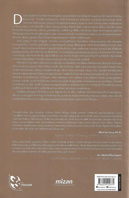 Di era digital seperti sekarang ini, masyarakat mendapat suguhan beragam berita, termasuk berita kekerasan, baik kekerasan wacana maupun kekerasan fisik. Sasaran kekerasan yang mengatasnamakan agama dan Tuhan pun melibatkan orang-orang non-Muslim atau orang-orang Barat dan orang-orang Islam sendiri yang berbeda keyakinan, aliran, pemikiran, pilihan politik, ideologi, atau kewarganegaraan. Mengapa mereka begitu yakin dan merasa absah melakukan kekerasan dengan mengatasnamakan agama dan Tuhan tanpa merasa salah sedikit pun.