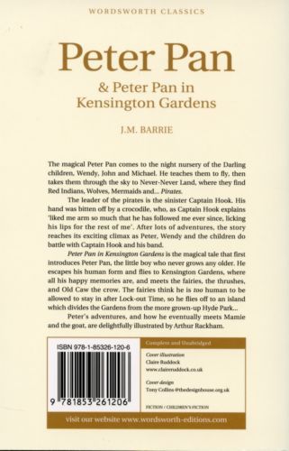 The magical Peter Pan comes to the night nursery of the Darling children, Wendy, John and Michael. He teaches them to fly, then takes them through the sky to Never-Never Land, where they find Red Indians, wolves, Mermaids and... Pirates. The leader of the pirates is the sinister Captain Hook. His hand was bitten off by a crocodile, who, as Captain Hook explains 'liked me arm so much that he has followed me ever since, licking his lips for the rest of me'. After lots of adventures, the story reaches its exciting climax as Peter, Wendy and the children do battle with Captain Hook and his band. Peter Pan in Kensington Gardens is the magical tale that first introduces Peter Pan, the little boy who never grows any older. He escapes his human form and flies to Kensington Gardens, where all his happy memories are, and meets the fairies, the thrushes, and Old Caw the crow. The fairies think he is too human to be allowed to stay in after Lock-out time, so he flies off to an island which divides the Gardens from the more grown-up Hyde Park - Peter's adventures, and how he eventually meets Mamie and the goat, are delightfully illustrated by Arthur Rackham.