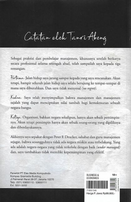 Kita akan memetik pembelajaran manajemen darinya yang sungguh luar biasa, utamanya, pembelajaran kebijaksanaan. Wisdom adalah paduan antara olah pikir, olah rasa dan olah tangan dalam eksekusi di lapangan. Maka dengan sengaja dirancang bahwa di setiap awal bab dari buku ini selalu diawali dengan pembelajaran wisdom values hasil olahannya. Pembelajaran kedua, bergabung dan belajarlah dari perusahaan the best. Tanri Abeng pada usia 29 tahun sudah menjadi direktur termuda di dunia (di Union Carbide), perusahaan multi nasional. Sarannya, "Bergabunglah dengan perusahaan yang baik di usia 20-an dan temukan atasan yang baik untuk belajar bagaimana berbisnis. Kemudian berkembanglah dan lakukan sesuatu." Pembelajaran ketiga, dari krisis menuju menjadi titik balik ke semakin baik adalah sebuah tantangan.