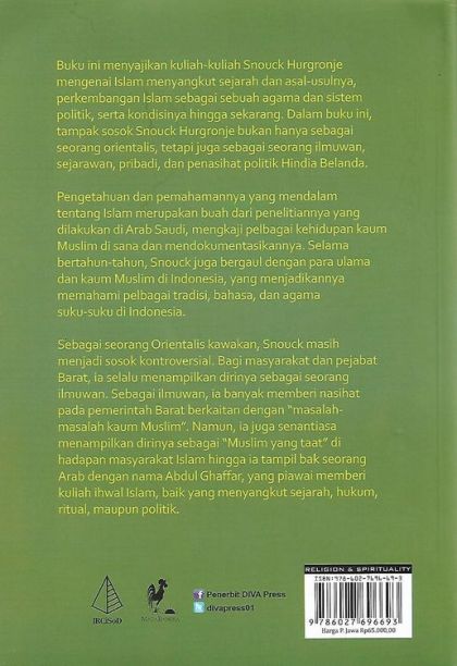 Buku ini menyajikan kuliah-kuliah Snouck Hurgronje mengenai Islam menyangkut sejarah dan asal-usulnya, perkembangan Islam sebagai sebuah agama dan system politik, serta kondisinya hingga sekarang. Dalam buku ini, tampak sosok Snouck Hurgronje bukan hanya sebagai seorang orientalis, tetapi juga sebagai seorang ilmuwan, sejarawan, pribadi, dan penasihat politik Hindia Belanda.Pengetahuan dan pemahamannya yang mendalam tentang Islam merupakan buah dari penelitiannya yang dilakukan di Arab Saudi, mengkaji pelbagai kehidupankaum Muslim di sana dan mendokumentasikannya. Selama bertahun-tahun, Snouck juga bergaul dengan para ulama dan kaum Muslim di Indonesia, yang menjadikannya memahami pelbagai tradisi, bahasa, dan agama suku-suku di Indonesia.Sebagai seorang Orientalis kawakan, Snouck masih menjadi sosok kontroversial. Bagi masyarakat dan pejabat Barat, ia selalu menampilkan dirinya sebagai seorang ilmuwan. Sebagai ilmuwan, ia banyak memberi nasihat pada pemerintah Barat berkaitan dengan “masalah-masalah kaum Muslim”. Namun, ia juga senantiasa menampilkan dirinya sebagai “Muslim yang taat” di hadapan masyarakat Islam hingga ia tampil bak seorang Arab dengan nama Abdul Ghaffar, yang piawai memberi kuliah ihwal Islam, baik yag menyangkut sejarah, hukum, ritual, maupun politik.