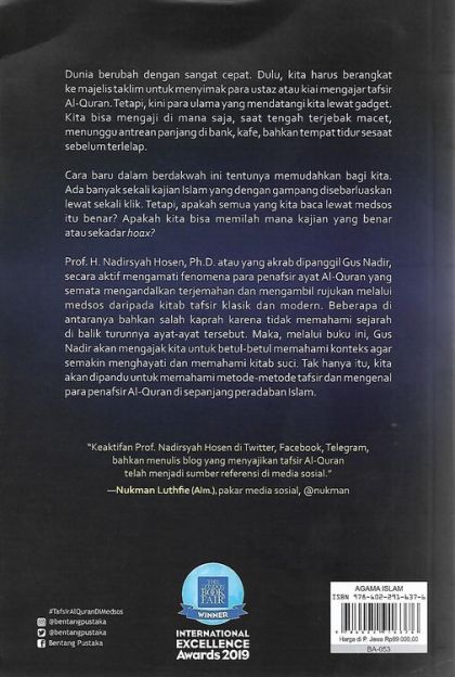 Dunia berubah dengan sangat cepat. Dulu, kita harus berangkat ke majelis taklim untuk menyimak para ustaz atau kiai mengajar tafsir Al-Quran. Tetapi, kini para ulama yang mendatangi kita lewat gagdet. Kita bisa mengaji di mana saja, saat tengah terjebak macet, menunggu antrean panjang di bank, kafe, bahkan tempat tidur sesaat sebelum terlelap. Cara baru dalam berdakwah ini tentunya memudahkan bagi kita. Ada banyak sekali kajian-kajian Islam yang dengan gampang disebarluaskan lewat sekali klik. Tetapi, apakah semua yang kita baca lewat medos itu benar? Apakah kita bisa memilah mana kajian yang benar atau sekadar hoax?Prof. H. Nadirsyah Hosen, Ph.D. atau yang akrab dipanggil Gus Nadir, secara aktif mengamati fenomena para penafsir ayat Al-Quran yang semata mengandalkan terjemahan dan mengambil rujukan melalui medsos daripada kitab tafsir klasik dan modern. Beberapa di antaranya bahkan salah kaprah karena tidak memahami sejarah di balik turunnya ayat-ayat tersebut. Maka, melalui buku ini, Gus Nadir akan mengajak kita untuk betul-betul memahami konteks agar semakin menghayati dan memahami kitab suci. Tak hanya itu, kita akan dipandu untuk memahami metode-metode tafsir dan mengenal para penafsir Al-Quran di sepanjang peradaban Islam.[Mizan, Bentang Pustaka, Bentang Bunyan, Indonesia, Agama, Islam, Kitab, Religi, Rohani]