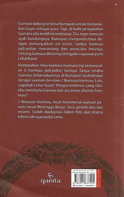 7 Manusia Harimau merupakan novel fenomenal warisan penulis besar Motinggo Busye. Novel ini merupakan bacaan yang seru, penuh aksi dan misteri. Sudah diadaptasi dalam film dan drama televisi dengan judul sama. Novel laga ini patut untuk masuk ke dalam wishlist buku bacaan Anda selanjutnya. Sinopsis Buku Gumara datang ke Desa Kumayan untuk menunaikan tugas sebagai guru. Tapi, di balik pengabdian Gumara ada motif tersembunyi. Dia ingin mencari ayah kandungnya. Kumayan menyambutnya dengan menunjukkan sisi mistis. Seekor harimau jadi-jadian menantang dan mencoba ilmunya. Untung Gumara ditolong oleh gadis rupawan putri Lebai Karat. Keampuhan ilmu Gumara memancing kemunculan 6 harimau jadi-jadian lainnya. Tanpa setahu Gumara, keberadaannya di Kumayan berkelindan dengan warisan dendam 7 Manusia Harimau. Lalu, siapakah Lebai Karat? Pertapa misterius yang tiba-tiba membela Gumara dari ancaman siluman harimau? Novel 7 Manusia Harimau Jilid 1: Pantang Berdendam merupakan karya yang luar biasa dari sang penulisnya, Motinggo Busye, yang merupakan sastrawan tersohor di zamannya. 7 Manusia Harimau sejatinya menceritakan tentang Legenda inyek di Bengkulu, Sumatra. Dari masing-masing tokoh, para pembaca diajarkan untuk tidak saling iri hati dan menaruh dendam terhadap orang lain. Informasi lain: Cover: Soft Cover Penulis: Motinggo Busye Tanggal Terbit: 3 Juni 2015 ISBN: 9786021637425 Penerbit: Mizan Publishing Jumlah Halaman: 544 Bahasa: Indonesia Genre: Fiksi Thriller Berat: 0.4 kg Panjang: 20.5 cm Lebar: 13 cm