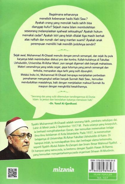 Bagaimana seharusnya menelisik kebenaran hadis Nabi Saw.? Apakah orang yang menolak hadis sahih bisa dianggap kufur? Sejauh mana Islam membolehkan seseorang melampiaskan syahwat seksualnya? Apakah hukum memakai cadar? Apakah istri yang telah ditalak tiga masih berhak atas nafkah dan rumah dari sang mantan suami? Apakah anak perempuan memiliki hak memilih jodohnya sendiri?Sejak awal, Muhammad Al-Ghazali menulis dengan penuh semangat, dan sejak itu pula karyanya telah menimbulkan diskusi pro dan kontra. Kuliah-kuliahnya di Fakultas Ushuluddin, Universitas Al-Azhar Mesir, pun sangat digemari oleh banyak mahasiswa. Materi ceramahnya yang selalu segar, gaya tuturnya yang penuh semangat dan terbuka, merupakan daya tarik yang sulit dipungkiri. Melalui buku ini, Muhammad Al-Ghazali berupaya menjelaskan perbedaan pemahaman menyangkut sekian banyak Sunnah Nabi Saw., kemudian mendudukkan masalahnya, baik dengan menjelaskan maksud Sunnah itu maupun dengan mengkritisi kesahihannya. [Mizan, Noura Books, Islam, Panduan, Tanya Jawab, Ustadz, Konsultasi, Indonesia]