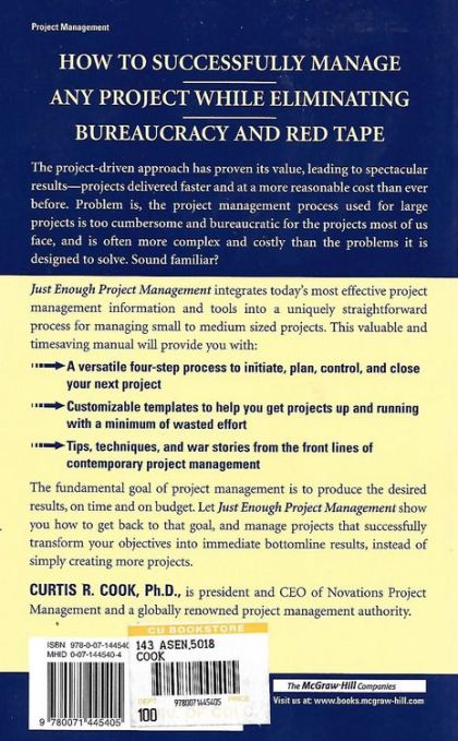 Practical, proven techniques for managing today's smaller, more mission-critical projects Managers who can bring projects in on time, under budget, and within specs are among the most valuable and marketable in today's project-driven environment. Just Enough Project Management-- written by globally renowned project management authority Curtis R. Cook--is a quick-hitting, no-nonsense pocket guide on how to successfully handle projects of any size, in any environment. This versatile book's one-of-a-kind, customizable templates free managers from the time-consuming process of having to reinvent basic techniques and methods from one project to the next. Valuable for projects of every size, but especially helpful for today's newer breed of tighter, more focused projects, Just Enough Project Management will help project managers achieve: Greater bottom-line performance Dramatically improved team morale Long-term competitive advantage