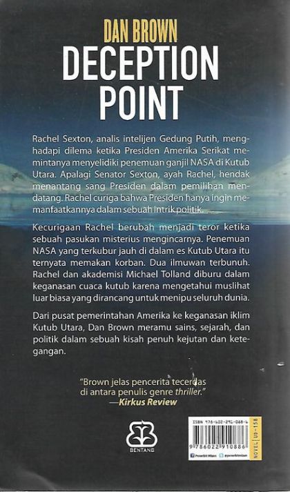 Rachel Sexton, Analis Intelijen Gedung Putih, Menghadapi Dilema Ketika Presiden Amerika Serikat Memintanya Menyelidiki Penemuan Ganjil Nasa Di Kutub Utara. Apalagi Senator Sexton, Ayah Rachel, Hendak Menantang Sang Presiden Dalam Pemilihan Mendatang. Rachel Curiga Bahwa Presiden Hanya Ingin Memanfaatkannya Dalam Sebuah Intrik Politik. Kecurigaan Rachel Berubah Menjadi Teror Ketika Sebuah Pasukan Misterius Mengincarnya. Penemuan Nasa Yang Terkubur Jauh Di Dalam Es Kutub Utara Itu Ternyata Memakan Korban. Dua Ilmuwan Terbunuh. Rachel Dan Akademisi Michael Tolland Diburu Dalam Keganasan Cuaca Kutub Karena Mengetahui Muslihat Luar Biasa Yang Dirancang Untuk Menipu Seluruh Dunia. Dari Pusat Pemerintahan Amerika Ke Keganasan Iklim Kutub Utara, Dan Brown Meramu Sains, Sejarah, Dan Politik Dalam Sebuah Kisah Penuh Kejutan Dan Ketegangan. Luar Biasa! Gabungan Aksi Dan Intrik Canggih, Didukung Riset Terperinci. -publishers Weekly Brown Jelas Pencerita Tecerdas Di Antara Penulis Genre Thriller. -kirkus Review [mizan, Dan Brown, Novel, Terjemahan, Best Seller, Fantasi, Fiksi, Indonesia, Dunia]