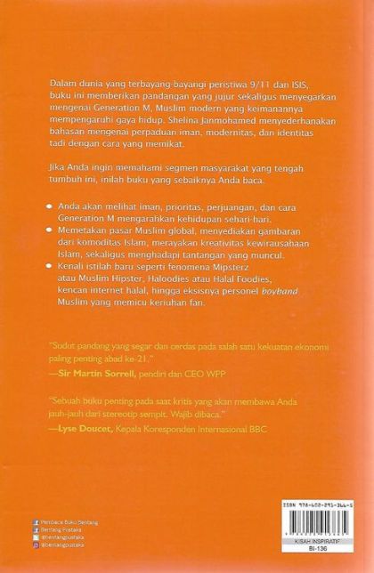 Dalam Dunia Yang Terbayang-bayangi Peristiwa 9/11 Dan Isis, Buku Ini Memberikan Pandangan Yang Jujur Sekaligus Menyegarkan Mengenai Generation, Muslim Modern Yang Keimanannya Mempengaruhi Gaya Hidup. Shelina Janmohamed Menyederhanakan Bahasan Mengenai Perpaduan Iman, Modernitas, Dan Identitas Tadi Dengan Cara Yang Memikat. Jika Anda Ingin Memahami Segmen Masyarakat Yang Tengah Tumbuh Ini, Inilah Buku Yang Sebaiknya Anda Baca. - Anda Akan Melihat Iman, Prioritas, Perjuangan, Dan Cara Generation M Mengarahkan Kehidupan Sehari-hari. - Memetakan Pasar Muslim Global, Menyediakan Gambaran Dari Komoditas Islam, Merayakan Kreativitas Kewirausahaan Islam, Sekaligus Menghadapi Tantangan Yang Muncul. - Kenali Istilah Baru Seperti Fenomena Mipsterz Atau Muslim Hipster, Haloodies Atau Halal Foodies, Kencan Internet Halal, Hingga Eksisnya Personel Boyband Muslim Yang Memicu Keriuhan Fan. [mizan, Bentang Pustaka, Muslim, Generasi, Ekonomi, Islam, Dunia, Global, Indonesia, Terjemahan] Spesial Seri Bentang Bisnis & Startup