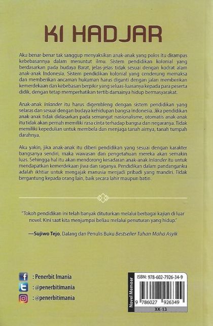 Ki Hajar Dewantara adalah sosok bangsawan Jawa yang merupakan pelopor pendidikan bagi kaum pribumi Indonesia pada zaman penjajahan Belanda. Beliau mendirikan Perguruan Taman Siswa untuk memberikan kesempatan bagi kaum pribumi Indonesia agar bisa mengenyam pendidikan yang setara dengan kaum bangsawan. Sinopsis Aku benar-benar tak sanggup menyaksikan anak-anak yang polos itu dirampas kebebasannya dalam menuntut ilmu. Sistem pendidikan kolonial yang berdasarkan pada budaya Barat, jelas-jelas tidak sesuai dengan kodrat alam anak-anak Indonesia. Sistem pendidikan kolonial yang cenderung memaksa dan memberikan ancaman hukuman harus diganti dengan jalan memberikan kemerdekaan dan kebebasan berpikir yang seluas-luasnya kepada para peserta didik, dengan tetap memperhatikan tertib damainya hidup bermasyarakat. Anak-anak Inlander itu harus digembleng dengan sistem pendidikan yang selaras dan sesuai dengan budaya kehidupan bangsa Indonesia. Jika pendidikan anak-anak tidak didasarkan pada semangat nasionalisme, otomatis anak-anak itu tidak akan pernah memiliki rasa cinta terhadap bangsa dan negaranya. Tidak memiliki kepedulian untuk membela dan menjaga tanah airnya, tanah tumpah darahnya. Aku yakin, jika anak-anak itu diberi pendidikan yang sesuai dengan karakter bangsanya sendiri, maka wawasan dan pengetahuan mereka akan semakin luas. Sehingga hal itu akan mendorong kesadaran anak-anak Inlander itu untuk mendapatkan kemerdekaan jiwa dan raganya. Pendidikan dalam pandanganku adalah ikhtiar untuk mengajak manusia menjadi pribadi yang mandiri. Tidak bergantung kepada orang lain, baik secara lahir maupun batin.