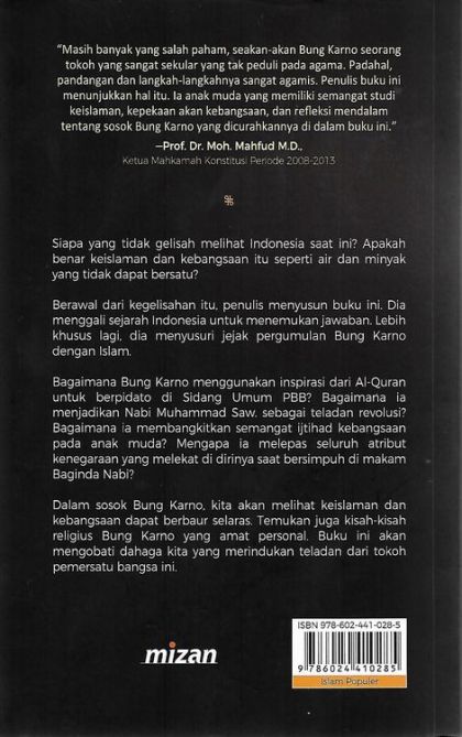 Siapa yang tidak gelisah melihat Indonesia saat ini? Apakah benar keislaman dan kebangsaan itu seperti air dan minyak yang tidak dapat bersatu? Berawal dari kegelisahan itu, penulis menyusun buku ini. Dia menggali sejarah Indonesia untuk menemukan jawaban. Lebih khusus lagi, dia menyusuri jejak pergumulan Bung Karno dengan Islam. Bagaimana Bung Karno menggunakan inspirasi dari Al-Qur'an untuk berpidato di Sidang Umum PBB? Bagaimana ia menjadikan Nabi Muhammad sebagai teladan revolusi? Bagaimana ia membangkitkan semangat ijtihad kebangsaan pada anak muda? Mengapa ia melepas seluruh atribut kenegaraan yang melekat di dirinya saat bersimpuh di makam Baginda Nabi? Dalam sosok Bung Karno, kita akan melihat keislaman dan kebangsaan dapat berbaur selaras. Temukan juga kisah-kisah religius Bung Karno yang amat personal. Buku ini akan mengobati dahaga kita yang merindukan teladan dari tokoh pemersatu bangsa ini.