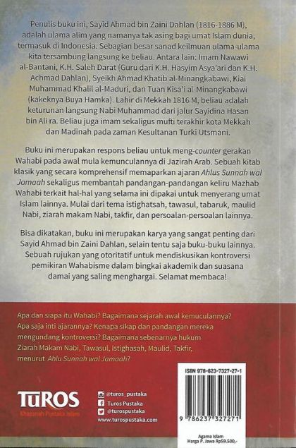 Menolak Mazhab Wahabi : Ulasan Kritis Kesalahan dan Penyelewengan Wahabi Kaum Wahabi memiliki karakteristik khas yang terangkum dalam empat kata kunci: kafir, bid’ah, sesat, dan musyrik. Keempat kata ini kerap kali dituduhkan kepada umat Islam lain yang tidak sejalan dengan mereka. Klaimnya adalah akidah merekalah yang paling benar dan paling bersih dari unsur kemusyrikan. Padahal yang terjadi justru sebaliknya. Buku ini secara komprehensif memaparkan ajaran Islam Ahlus Sunnah wal Jamaah dalam membantah pandangan Kaum Wahabi terkait isu-isu yang selama ini dipakai untuk menyerang umat Islam lain. Mulai dari istighatsah, tawasul, tabaruk, peringatan maulid Nabi, ziarah makam Nabi, syafaat hingga meminta keberkahan dari orang-orang saleh. Di kalangan pesantren, nama penulis buku ini sudah tak asing lagi. Syekh Ahmad bin Zaini Dahlan adalah guru dari para ulama Nusantara, pembela Ahlus Sunnah wal Jamaah sekaligus keturunan Sayidina Hasan, cucu Rasulullah saw. Banyak ulama dari berbagai dunia menimba ilmu darinya. Buku ini merupakan sumbangsih yang amat berharga dalam meng-counter gerakan intoleran Wahabi, sekaligus rujukan paling lengkap dalam mengembalikan ajaran Islam yang sesungguhnya, yaitu Islam yang toleran, inklusif, menghargai perbedaan dan damai.
