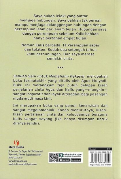 Saya bukan lelaki yang pintar menjaga hubungan. Saya bahkan tak pernah mampu menjaga kelanggengan hubungan dengan perempuan lebih dari enam bulan. Hubungan saya dengan perempuan sebelum Kalis bahkan hanya bertahan empat bulan. Namun Kalis berbeda. Ia Perempuan sabar dan telaten. Sudah dua setengah tahun kami berhubungan. Dan saya merasa semakin cinta. *** Sebuah Seni untuk Memahami Kekasih, merupakan buku termutakhir yang ditulis oleh Agus Mulyadi. Buku ini merangkum tiga puluh delapan kisah perjalanan cinta Agus dan Kalis yang—mungkin—sangat inspiratif dan layak diteladani bagi pasangan muda mudi masa kini. Ini merupakan buku yang penuh kenarsisan dan sangat megalomaniak. Konon menurutnya, kisah-kisah perjalanan cinta dan kelucuannya bersama Kalis sangat sayang jika hanya disimpan untuk dirinya sendiri.