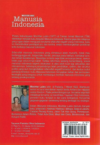 Pidato kebudayaan Mochtar Lubis (1977) di Taman Ismail Marzuki (TIM) diterbitkan menjadi buku berjudul Manusia Indonesia. Karena gaya dan sikapnya yang lugas dalam mengupas terutama sifat-sifat negatif orang Indonesia, buku ini menimbulkan pendapat pro dan kontra, selain membangkitkan pemikiran kritis tentang manusia Indonesia.Sifat-sifat manusia Indonesia yang dimaksud ialah munafik, tidak mau bertanggungjawab, berperilaku feodal, percaya pada takhyul, berbakat seni, dan lemah karakternya. Stereotipe ini tentu saja tidak semuanya benar, namun tidak juga seluruhnya salah. Ketika reformasi sedang berkembang, sosok manusia Indonesia seperti dilukiskan di atas lebih kuat lagi aktualitas dan relevansinya. beberapa penyebabnya ialah pendidikan, sistem, dan struktur politik yang ikut mengentalkan sifat-sifat negatif tersebut. dari kedua sudut pandang tersebut, buku Manusia Indonesia menyajikan bahan dan permulaan kerangka yang berguna untuk membangun kembali manusia Indonesia yang sedang porak-poranda.
