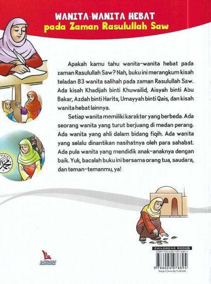Penyebaran dakwah Islam tidak hanya dilakukan oleh sahabat laki-laki Rasulullah, ada juga tokoh-tokoh wanita pada zaman Rasulullah yang ikut menjadi peran penting dalam menyebarkan agama Islam. Tidak hanya menyebarkan hukum-hukum Islam saja, wanita-wanita hebat pada zaman Rasulullah memiliki jasa lain yang luar biasa, seperti mendidik anak-anak agar menjadi generasi penerus Islam, serta ikut serta dalam meriwayatkan hadis-hadis Rasulullah saw. Apakah kamu tahu siapa saja wanita-wanita hebat pada zaman Rasulullah saw.? Buku ini merangkum kisah-kisah teladan dari 83 wanita salihah pada zaman Rasulullah saw. Ada kisah Khadijah binti Khuwalid, Aisyah binti Abu Bakar, Azdah binti Harits, Umayyah binti Qais, dan kisah wanita hebat lainnya. Tokoh-tokoh wanita yang mucul dalam buku memiliki karakter yang berbeda-beda. Ada wanita yang turut berjuang di medang perang, wanita yang ahli di bidang fikih, wanita yang selalu dinantikan nasihatnya oleh para sahabat, dan wanita yang mendidik anak-anaknya dengan baik. Mereka adalah wanita-wanita hebat yang berani berkorban meninggalkan segala yang dimilikinya untuk kepentingan Islam. Semoga pengalaman-pengalaman wanita hebat pada zaman Rasulullah dapat menjadi contoh teladan yang baik bagi para kaum hawa di zaman sekarang, agar memiliki keimanan yang kokoh terhadap agama islam. Yuk, baca buku ini bersama orang tua, saudara, dan teman-temanmu! Informasi Buku Penulis : Wirasakti Setyawan Harga : Rp56.100 Penerbit : Transmedia Jumlah Halaman : 168 halaman Tanggal Terbit : 25 November 2019 Bahasa : Indonesia ISBN : 9786237100249 SKU : 208044192 Width : 13 cm Height : 19 cm Weight : 0,2 kg Jenis Cover : Soft cover