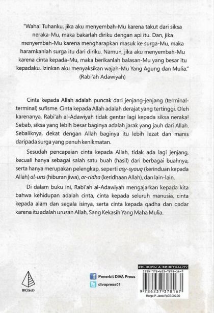 “Wahai Tuhanku, jika aku menyembah-Mu karena takut dari siksa neraka-Mu, maka bakarlah diriku dengan api itu. Dan, jika menyembah-Mu karena mengharapkan masuk ke surga-Mu, maka haramkanlah surga itu dari diriku. Namun, jika aku menyembah-Mu karena cinta kepada-Mu, maka berikanlah balasan-Mu yang besar itu kepadaku. Izinkan aku menyaksikan wajah-Mu Yang Agung dan Mulia.” (Rabi’ah Adawiyah)* Cinta kepada Allah adalah puncak dari jenjang-jenjang (terminal-terminal) sufisme. Cinta kepada Allah adalah derajat yang tertinggi. Oleh karenanya, Rabi’ah al-Adawiyah tidak gentar lagi kepada siksa neraka! Sebab, siksa yang lebih besar baginya adalah jarak yang jauh dari Allah. Sebaliknya, dekat dengan Allah baginya itu lebih lezat dan manis daripada surga yang penuh kenikmatan.Sesudah pencapaian cinta kepada Allah, tidak ada lagi jenjang, kecuali hanya sebagai salah satu buah (hasil) dari berbagai buahnya, serta hanya merupakan pelengkap, seperti asy-syauq (kerinduan kepada Allah) al-uns (hiburan jiwa), ar-ridha (keridhaan Allah), dan lain-lain.Di dalam buku ini, Rabi’ah al-Adawiyah mengajarkan kepada kita bahwa kehidupan adalah cinta, cinta kepada seluruh manusia, cinta kepada alam dan segala isinya, serta cinta kepada qadha dan qadar karena itu adalah urusan Allah, Sang Kekasih Yang Maha Mulia.
