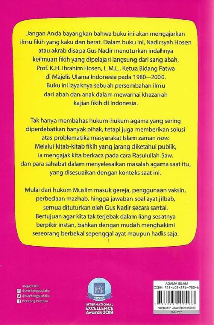 Jangan Anda bayangkan bahwa buku ini akan mengajarkan ilmu fikih yang kaku dan berat. Dalam buku ini, Nadirsyah Hosen atau akrab disapa Gus Nadir, menuturkan indahnya keilmuan fikih yang dipelajari langsung dari sang bapak, Prof. K.H. Ibrahim Hosen, L.M.L., Ketua Bidang Fatwa di Majelis Ulama Indonesia pada 1980-2000. Buku ini layaknya sebuah persembahan ilmu dari Abah dan anak, dalam mewarnai khazanah kajian fikih di Indonesia.