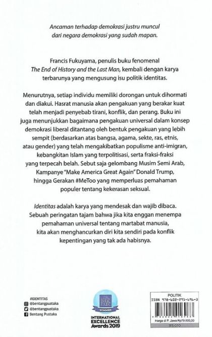 Francis Fukuyama, penulis buku fenomenal The End of History and the Last Man, kembali dengan karya terbarunya yang mengusung isu politik identitas. Menurutnya, setiap individu memiliki dorongan untuk dihormati dan diakui. Hasrat manusia akan pengakuan yang berakar kuat telah menjadi penyebab tirani, konflik, dan perang. Buku ini juga menunjukkan bagaimana pengakuan universal dalam konsep demokrasi liberal ditantang oleh bentuk pengakuan yang lebih sempit (berdasarkan atas bangsa, agama, sekte, ras, etnis, atau gender) yang telah mengakibatkan populisme anti-imigran, kebangkitan Islam yang terpolitisasi, serta fraksi-fraksi yang terpecah belah. Sebut saja gelombang Musim Semi Arab, Kampanye “Make America Great Again” Donald Trump, hingga Gerakan #MeToo yang memperluas pemahaman populer tentang kekerasan seksual. Identitas adalah karya yang mendesak dan wajib dibaca. Sebuah peringatan tajam bahwa jika kita enggan menempa pemahaman universal tentang martabat manusia, kita akan menghancurkan diri kita sendiri pada konflik kepentingan yang tak ada habisnya.