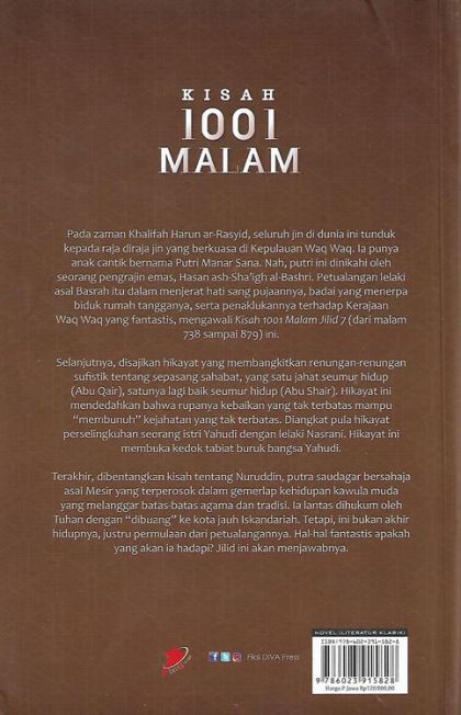 Pada zaman Khalifah Harun ar-Rasyid, seluruh jin di dunia ini tunduk kepada seekor Raja Diraja Jin yang berkuasa di kepulauan Waq Waq. Ia punya anak cantik bernama Putri Manar Sana. Nah, putri ini dinikahi oleh seorang manusia pengrajin emas, Hasan ash-Sha’igh al-Bashri. Petualangan lelaki asal Basrah itu dalam menjerat hati sang pujaannya, badai yang menerpa biduk rumah tangganya, serta penaklukannya terhadap Kerajaan Waq Waq yang fantastis, mengawali Kisah 1001 Malam Jilid 7 (dari malam 738 sampai 879) ini.Selanjutnya, disajikan hikayat yang membangkitkan renungan-renungan sufistik tentang sepasang sahabat, yang satu jahat seumur hidup (Abu Qair), satunya lagi baik seumur hidup (Abu Shair). Hikayat ini mendedahkan bahwa rupanya kebaikan yang tak terbatas mampu “membunuh” kejahatan yang tak terbatas. Diangkat pula hikayat perselingkuhan seorang istri Yahudi—suaminya juga Yahudi—dengan lelaki Nasrani. Hikayat ini membuka kedok tabiat buruk bangsa Yahudi yang terkenal dalam al-Qur’an, yakni demi keselamatan, kesenangan, dan keuntungan dirinya, mereka mampu melakukan apa saja, termasuk sesuatu yang bertentangan dengan hati nuraninya sendiri.Terakhir, dibentangkan kisah tentang saudagar bersahaja asal Mesir, Tajuddin, yang putranya, Nuruddin, terperosok dalam gemerlap kehidupan kawula muda yang melanggar batas-batas agama dan tradisi. Padahal, mulanya ia seorang pemuda yang tak akan melakukan apa pun tanpa diperintahkan oleh Allah Swt. dan tanpa izin dari orang tuanya. Ia lantas dihukum oleh Tuhan dengan “dibuang” ke kota jauh Iskandariah. Tetapi, ini bukan akhir hidupnya, justru permulaan dari petualangannya. Hal-hal fantastis apakah yang akan ia hadapi? Jilid ini akan menjawabnya.
