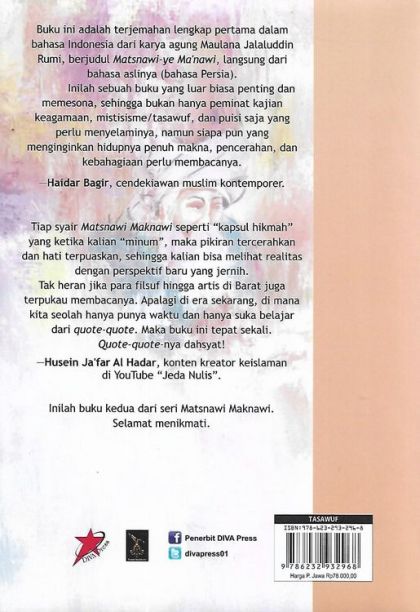 Buku Ini Adalah Terjemahan Lengkap Pertama Dalam Bahasa Indonesia Dari Karya Agung Maulana Jalaluddin Rumi, Berjudul Matsnawi-ye Ma’nawi, Langsung Dari Bahasa Aslinya (bahasa Persia). Inilah Sebuah Buku Yang Luar Biasa Penting Dan Memesona, Sehingga Bukan Hanya Peminat Kajian Keagamaan, Mistisisme/tasawuf, Dan Puisi Saja Yang Perlu Menyelaminya, Namun Siapa Pun Yang Menginginkan Hidupnya Penuh Makna, Pencerahan, Dan Kebahagiaan Perlu Membacanya. —haidar Bagir, Cendekiawan Muslim Kontemporer. Tiap Syair Matsnawi Maknawi Seperti “kapsul Hikmah” Yang Ketika Kalian “minum”, Maka Pikiran Tercerahkan Dan Hati Terpuaskan, Sehingga Kalian Bisa Melihat Realitas Dengan Perspektif Baru Yang Jernih. Tak Heran Jika Para Filsuf Hingga Artis Di Barat Juga Terpukau Membacanya. Apalagi Di Era Sekarang, Di Mana Kita Seolah Hanya Punya Waktu Dan Hanya Suka Belajar Dari Quote-quote. Maka Buku Ini Tepat Sekali. Quote-quote-nya Dahsyat! —husein Ja’far Al Hadar, Konten Kreator Keislaman Di Youtube “jeda Nulis”. Inilah Buku Kedua Dari Seri Matsnawi Maknawi. Selamat Menikmati.