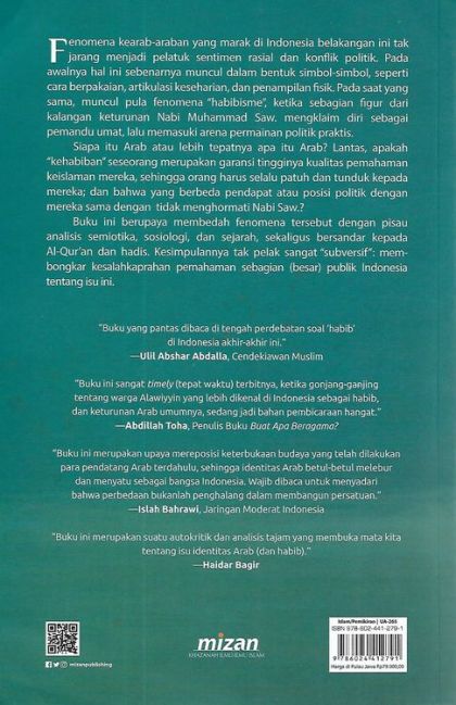 Buku ini, antara lain, berupaya melakukan dekonstruksi tersebut. Tujuannya bukan untuk membela Arab sebagai ilusi identitas kebangsaan milik suku-suku bangsa tertentu, tetapi untuk melepaskan unsur-unsur ikutan yang dangkal dan superfisial itu. Buku ini justru berupaya membebaskan identitas Arab, yang sejatinya merupakan bahasa wahyu yang suci, dari klaim-klaim palsu para pendomplengnya dan juga dari intrik para politisi yang mengeksploitasinya. Dengan cara itu, kita selamatkan identitas Arab dari kontestasi politik, juga dari potensi ujaran-ujaran kebencian terhadap perilaku satu-dua anggota komunitas yang disebut sebagai keturunan Arab.