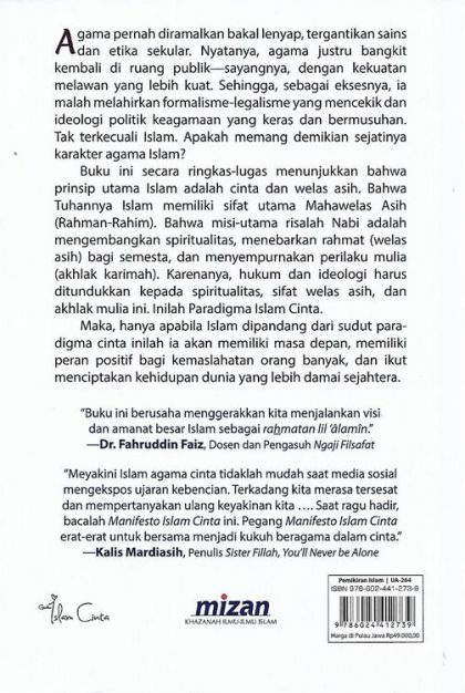 Buku Pak Haidar Bagir yang berjudul Manifesto Islam Cinta, buku yang tidak hanya memahamkan tapi juga mengingatkan serta menggerakkan. Buku ini menyadarkan kita, ternyata banyak pola hidup, gaya kita beragama akhir-akhir ini justru menjauh dari karakter utama islam yang sering kita cerahmahkan yaitu islam rahmatan lil 'alamain. Sering kita lihat fenomena-fenomena hari ini munculnya konflik-konflik di antara kita dalam berbagai skala dan polanya. Lahirnya klaim-klaim kebenaran yang melahirkan perselisihan-perselisihan, kadang-kadang muncul semangat untuk menjatuhkan yang lain yang dianggap berbeda. Kita sering lupa bahwa visi besar hadirnya islam antara lain adalah sebagai kendaraan untuk menebarkan cinta dan kasih sayang ke seluruh penjuru alam semesta. Buku ini dengan manifestonya, dengan penegasan-penegasannya tentang karakter islam yang penuh rahmat adalah semacam mainstreaming, pengarusutamaan cinta dan kasih sayang dalam kehidupan ini khususnya sebagai dasar kita untuk beragama. Menurut saya upaya pengarusutaamaan ini penting, karena banyak hal penting tersisihkan oleh berbagai hal yang remeh temeh. Kita terjauhkan dari nilai utama hidup, kemanusiaan termasuk nilai cinta dan kasih sayang. Mari kita dukung upaya untuk melakukan mantreaming islam cinta sebagaimana yang dilakukan oleh Pak Haidar. Buku ini berusaha menggerakkan kita menjalankan visi dan amanat besar islam sebagai rahmatan lil alamin.