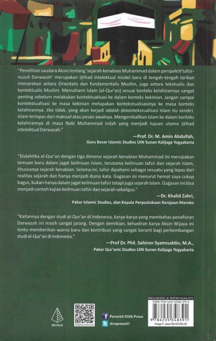 “Penelitian saudara Aksin tentang ‘sejarah kenabian Muhammad dalam perspektif tafsir-nuzuli Darwazah’ merupakan ijtihad intelektual model baru di tengah-tengah tarikan interpretasi antara Orientalis dan fundamentalis Muslim, juga antara tekstualis dan kontektualis Muslim. Memahami Islam (al-Qur’an) sesuai konteks kelahirannya sangat penting sebelum melakukan kontektualisasi ke dalam konteks kekinian. Jangan sampai kontekstualisasi ke masa kekinian melupakan kontekstualisasinya ke masa konteks kelahirannya. Jika tidak, yang akan terjadi adalah dekontekstualisasi Islam itu sendiri. Islam terlepas dari maksud atau pesan awalnya. Mengembalikan Islam ke dalam konteks kelahirannya di masa Nabi Muhammad inilah yang menjadi tujuan utama ijtihad intelektual Darwazah.”—Prof. Dr. M. Amin Abdullah, Guru Besar Islamic Studies UIN Sunan Kalijaga Yogyakarta “Dialektika al-Qur’an dengan tiga dimensi sejarah kenabian Muhammad ini merupakan temuan baru dalam jagat keilmuan Islam, terutama keilmuan tafsir dan sejarah Islam, khususnya sejarah kenabian. Selama ini, tafsir dipahami sebagai sesuatu yang lepas dari realitas sejarah dan hanya menjadi dunia kata. Gagasan ini menurut hemat saya cukup bagus, bukan hanya dalam jagat keilmuan tafsir tetapi juga sejarah Islam. Gagasan ini bisa menjadi contoh kajian keilmuan tafsir dan sejarah sekaligus.” —Dr. Khalid Zahri, Pakar Islamic Studies, dan Kepala Perpustakaan Kerajaan Maroko “Kaitannya dengan studi al-Qur’an di Indonesia, karya-karya yang membahas penafsiran Darwazah ini masih sangat jarang. Dengan demikian, kehadiran karya Aksin Wijaya ini tentu memberikan warna baru dan kontribusi yang sangat berarti bagi perkembangan studi al-Qur’an di Indonesia.” —Prof Dr. Phil. Sahiron Syamsuddin, M.A., Pakar Qur’anic Studies UIN Sunan Kalijaga Yogyakarta
