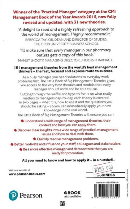 Winner of the ‘Practical Manager’ category at the CMI Management Book of the Year Awards 2015 and now fully revised, updated and with 31 new theories.“A delight to read and a highly refreshing approach to the world of management. I highly recommend it.” Rebecca Taylor, the Dean and Director of Studies at the Open University Business School‘I’ll make sure that every manager in our pharmacy outlets gets a copy of this book.’ Manjit Jhooty, Managing Director, Jhoots Pharmacy‘Every manager should read this book.’Geoff Round, Chief Executive, Birmingham Civic Housing Association Ltd101 management theories from the world’s best management thinkers – the fast, focussed and express route to success.As a busy manager, you need solutions to everyday work problems fast. The Little Book of Big Management Theories gives you access to the very best theories and models that every manager should know and be able to use.Cutting through the waffle and hype to focus only on the ones that really matter to managers day-to-day, each theory is covered in two pages – what it is, how to use it and the questions you should be asking – so you can immediately apply your new knowledge in the real world.The Little Book of Big Management Theories will ensure you can:· Understand a wide range of management theories, their context and how you can apply them· Discover clear insights into a wide range of practical management issues and how to deal with them.· Quickly resolve a wide range of management problems· Better motivate and influence your staff, colleagues and stakeholders· Be a more effective manager and demonstrate that you are ready for promotionAll you need to know and how to apply it – in a nutshell.Winner of the ‘Practical Manager’ category at the Chartered Management Institute Management Book of the Year Awards.Rebecca Taylor, the Dean and Director of Studies at the Open University Business School, explained why the book deserved to win:“This book was a delight to read and was a highly refreshing approach to the world of management. The ‘big’ ideas have been boiled down into easily-digestible chunks that are perfect either as an introduction or a refresher for the more experienced manager. The personal writing style and lack of preaching makes it a brilliant desk-side companion for a manager of any level, and I highly recommend it.”