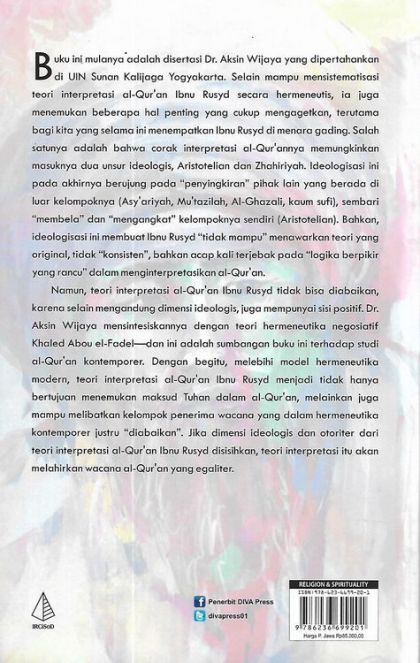 Buku ini mulanya adalah disertasi Dr. Aksin Wijaya yang dipertahankan di UIN Sunan Kalijaga Yogyakarta. Selain mampu mensistematisasi teori interpretasi al-Qur’an Ibnu Rusyd secara hermeneutis, ia juga menemukan beberapa hal penting yang cukup mengagetkan, terutama bagi kita yang selama ini menempatkan Ibnu Rusyd di menara gading. Salah satunya adalah bahwa corak interpretasi al-Qur’annya memungkinkan masuknya dua unsur ideologis, Aristotelian dan Zhahiriyah. Ideologisasi ini pada akhirnya berujung pada “penyingkiran” pihak lain yang berada di luar kelompoknya (Asy’ariyah, Mu’tazilah, Al-Ghazali, kaum sufi), sembari “membela” dan “mengangkat” kelompoknya sendiri (Aristotelian). Bahkan, ideologisasi ini membuat Ibnu Rusyd “tidak mampu” menawarkan teori yang original, tidak “konsisten”, bahkan acap kali terjebak pada “logika berpikir yang rancu” dalam menginterpretasikan al-Qur’an. Namun, teori interpretasi al-Qur’an Ibnu Rusyd tidak bisa diabaikan, karena selain mengandung dimensi ideologis, juga mempunyai sisi positif. Dr. Aksin Wijaya mensintesiskannya dengan teori hermeneutika negosiatif Khaled Abou el-Fadel—dan ini adalah sumbangan buku ini terhadap studi al-Qur’an kontemporer. Dengan begitu, melebihi model hermeneutika modern, teori interpretasi al-Qur’an Ibnu Rusyd menjadi tidak hanya bertujuan menemukan maksud Tuhan dalam al-Qur’an, melainkan juga mampu melibatkan kelompok penerima wacana yang dalam hermeneutika kontemporer justru “diabaikan”. Jika dimensi ideologis dan otoriter dari teori interpretasi al-Qur’an Ibnu Rusyd disisihkan, teori interpretasi itu akan melahirkan wacana al-Qur’an yang egaliter.