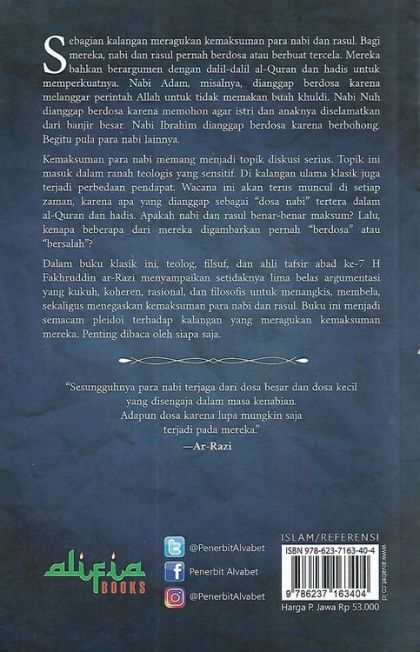 Sebagian kalangan meragukan kemaksuman para nabi dan rasul. Bagi mereka, nabi dan rasul pernah berdosa atau berbuat tercela. Mereka bahkan berargumen dengan dalil-dalil al-Quran dan hadis untuk memperkuatnya. Nabi Adam, misalnya, dianggap berdosa karena melanggar perintah Allah untuk tidak memakan buah khuldi. Nabi Nuh dianggap berdosa karena memohon agar istri dan anaknya diselamatkan dari banjir besar. Nabi Ibrahim dianggap berdosa karena berbohong. Begitu pula para nabi lainnya.Kemaksuman para nabi memang menjadi topik diskusi serius. Topik ini masuk dalam ranah teologis yang sensitif. Di kalangan ulama klasik juga terjadi perbedaan pendapat. Wacana ini akan terus muncul di setiap zaman, karena apa yang dianggap sebagai “dosa nabi” tertera dalam al-Quran dan hadis. Apakah nabi dan rasul benar-benar maksum? Lalu, kenapa beberapa dari mereka digambarkan pernah “berdosa” atau “bersalah”?Dalam buku klasik ini, teolog, filsuf, dan ahli tafsir abad ke-7 H Fakhruddin ar-Razi menyampaikan setidaknya lima belas argumentasi yang kukuh, koheren, rasional, dan filosofis untuk menangkis, membela, sekaligus menegaskan kemaksuman para nabi dan rasul. Buku ini menjadi semacam pleidoi terhadap kalangan yang meragukan kemaksuman mereka. Penting dibaca oleh siapa saja.