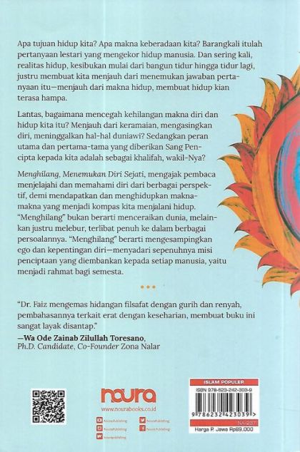 “Hanyut, lebur, dan asyik-masyuk. Itulah yang saya alami saat membaca buku Menghilang, Menemukan Diri Sejati karya Dr. Fahruddin Faiz. Buku ini tidak hanya menyuguhkan pemikiran para filsuf atau pandangan filsafat tentang kehidupan, tetapi juga menuntun pembaca berfilsafat. Pembaca diajak untuk berefleksi mengenai diri dan kedirian dalam proses ‘menjadi’ manusia, serta ‘memaknai’ hidupnya. Saya yakin, buku ini akan diminati khalayak luas karena pembahasannya terkait erat dengan keseharian. Ditambah lagi, Dr. Faiz berhasil mengemas hidangan filsafat dengan gurih dan renyah, membuat buku ini sangat layak disantap oleh siapa pun yang ingin menyelami dirinya. Selamat membaca, selamat mengada!”