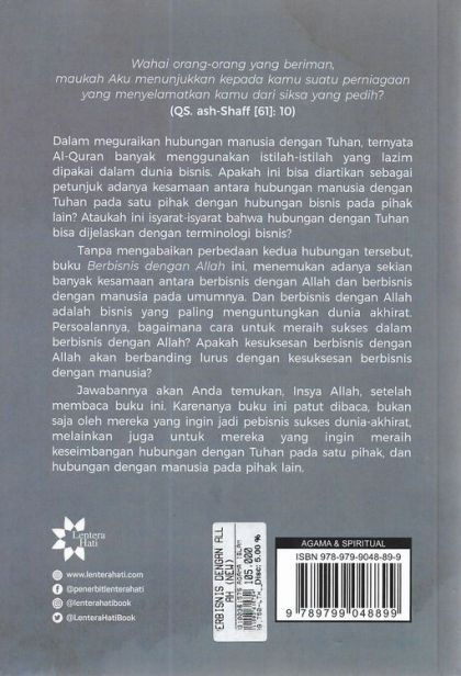 Wahai orang-orang yang beriman, maukah Aku menunjukkan kepada kamu suatu perniagaan yang menyelamatkan kamu dari siksa yang pedih? (QS. ash-Shaff [61]: 10) Dalam meguraikan hubungan manusia dengan Tuhan, ternyata Al-Quran banyak menggunakan istilah-istilah yang lazim dipakai dalam dunia bisnis. Apakah ini bisa diartikan sebagai petunjuk adanya kesamaan antara hubungan manusia dengan Tuhan pada satu pihak dengan hubungan bisnis pada pihak lain? Ataukah ini isyarat-isyarat bahwa hubungan dengan Tuhan bisa dijelaskan dengan terminologi bisnis? Tanpa mengabaikan perbedaan kedua hubungan tersebut, buku Berbisnis dengan Allah ini, menemukan adanya sekian banyak kesamaan antara berbisnis dengan Allah dan berbisnis dengan manusia pada umumnya.