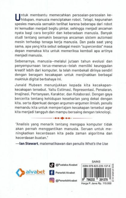 Junaid Mubeen menunjukkan kepada kita kecakapan-kecakapan tersebut. Yaitu Estimasi, Representasi, Penalaran, Imajinasi, Karakter, dan Kolaborasi. Dengan gaya bercerita tentang kehidupan keseharian yang dekat dengan kita, serta diperkuat dengan argumen-argumen ilmiah, penulis memandu kita untuk mempertajam kecakapan tersebut agar kita menjadi tangguh dan mampu bersaing dengan teknologi.