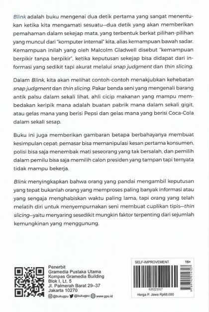 Dalam Blink, kita akan melihat contoh-contoh menakjubkan kehebatan snap judgment dan thin slicing. Pakar benda seni yang mengenali barang antik palsu dalam seni lihat, ahli cicip-makanan yang mampu membedakan keripik mana buatan pabrik mana dalam sekali gigit atau gelas mana yang berisi Pepsi dan gelas mana yang berisi Coca-Cola dalam sekali sesap.