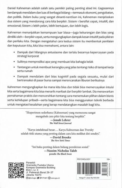 Daniel Kahneman adalah salah satu pemikir paling penting abad ini. Gagasannya berdampak mendalam dan luas di berbagai bidang termasuk ekonomi, pengobatan, dan politik. Dalam buku yang sangat dinanti-nantikan ini, Kahneman menjelaskan dua sistem yang mendorong cara kita berpikir. Sistem 1 bersifat cepat, intuitif, dan emosional; Sistem 2 lebih pelan, lebih bertujuan, dan lebih logis.
