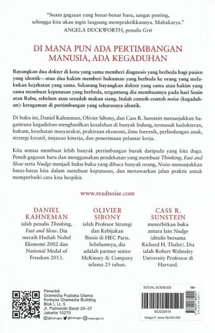 Kita semua membuat lebih banyak pertimbangan buruk daripada yang kita duga. Penuh gagasan baru dan menggunakan pendekatan yang membuat Thinking, Fast and Slow serta Nudge menjadi buku-buku yang dibaca banyak orang, Noise menunjukkan batas-batas kita dalam membuat keputusan, dan menawarkan jalan praktis untuk memperbaiki cara kita berpikir.