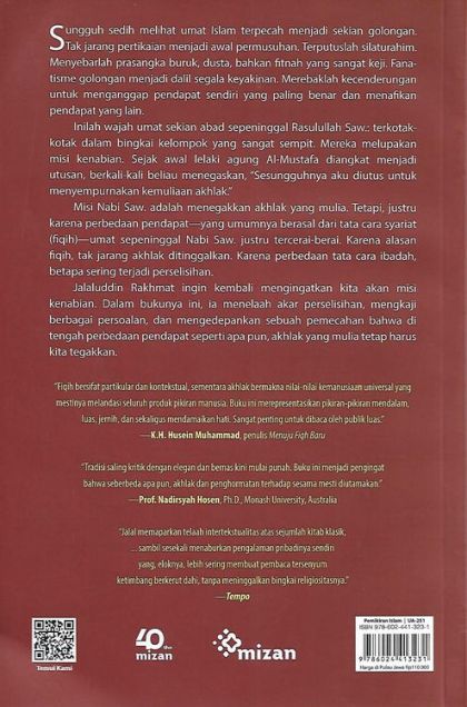 Jalaluddin Rakhmat ingin kembali mengingatkan kita akan misi kenabian. Dalam bukunya ini, ia menelaah akar perselisihan, mengkaji berbagai persoalan, dan mengedepankan sebuah pemecahan bahwa di tengah perbedaan pendapat seperti apa pun, akhlak yang mulia tetap harus kita tegakkan.