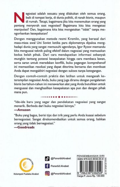 Dengan menggunakan metode resmi Kremlin, yang berasal dari masa-masa awal Uni Soviet ketika para diplomatnya dipaksa menghadapi dunia yang sangat memusuhi agendanya, Igor Ryzov memandu memuaskan kita menguasai teknik paling efektif dalam negosiasi yang kedua belah pihak. Dari cara mendapatkan informasi sebanyak mungkin tentang potensi kesepakatan hingga cara membaca lawan, serta saran untuk meredakan konflik, buku pegangan komprehensif ini memastikan resolusi yang dapat diterima bersama dan membuat Anda dapat mengakhiri negosiasi dengan sukses tanpa ketegangan.