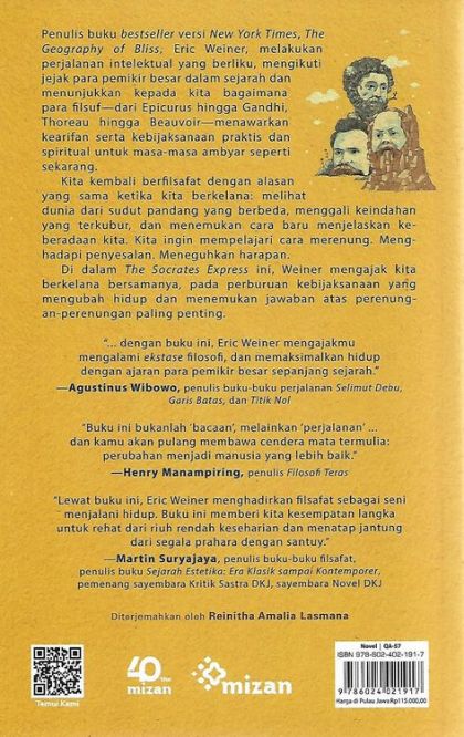 Di dalam The Socrates Express ini, Weiner mengajak kita berkelana bersamanya, pada perburuan kebijaksanaan yang mengubah hidup dan menemukan jawaban atas perenungan-perenungan paling penting.