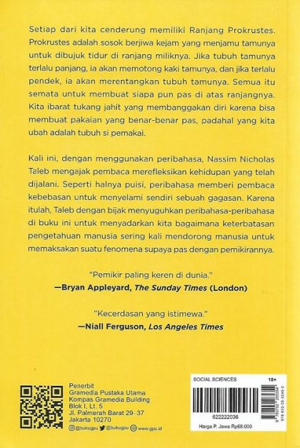 Kita ibarat tukang jahit yang membanggakan diri karena bisa membuat pakaian yang benar-benar pas. padahal yang kita ubah adalah tubuh si pemakai. Kali ini. dengan menggunakan peribahasa. Nassim Nicholas Taleb mengajak pembaca merefleksikan kehidupan yang telah dijalani.
