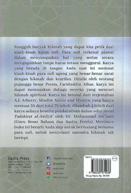 Sungguh banyak hikmah yang dapat kita petik dari kisah-kisah kaum sufi. Para sufi terkenal piawai dalam menyampaikan hal yang serius secara mengagumkan tanpa harus terasa menggurui. Karya yang berada tangan Anda saat ni memuat kisah-kisah para sufi agung yang benar-benar sarat dengan hikmah dan kearifan. Ditulis oleh seorang pujangga besar Persia, Fariduddin Athar, karya ini dapat memuaskan dahaga mereka yang mencari hikmah spiritual. Karya ini berasal dari terjemahan AJ. Arberry, Muslim Saints and Mystics, yang hanya memuat 38 dari total 72 tokoh, ditambah 4 tokoh dari karya aslinya beserta pendahuluan dalam edisi revisi Tadzkirat al-Awliyã' oleh Dr. Muhammad Isti'lami (Guru Besar Bahasa dan Sastra Persia). Membaca buku ini berarti Anda siap untuk bertualang bersama para sufi, untuk menyelami samudra hikmah tak bertepi.