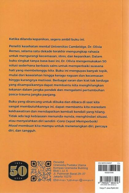Ketika dilanda kepanikan, segera ambil buku ini. Peneliti kesehatan mental Universitas Cambridge, Dr. Olivia Remes, selama satu dekade terakhir mengungkap rahasia untuk mengurangi kecemasan, stres, dan kepanikan. Dalam buku singkat tanpa basa-basi ini, Dr. Olivia mengemukakan 50 solusi sederhana berbasis sains untuk memperbaiki suasana hati yang membelenggu kita. Buku ini mengupas banyak topik, mulai dari kewalahan, keragu-raguan, kecemasan hingga kurangnya motivasi. Berbagai saran dan kiat tak terduga yang disampaikannya dapat membantu kita menghilangkan tekanan dalam jangka pendek dan mengalami pertumbuhan pasca-trauma jangka panjang. Buku yang dirancang untuk dibuka dan dibaca di saat kita sangat membutuhkannya, dapat membantu kita meredam kekhawatiran dan mendapatkan kembali kendali yang hilang. Tidak ada lagi kebiasaan menunda-nunda, menghindari situasi, atau menyalahkan diri sendiri—Cara Cepat Mamperbaiki Mood membuat kita mampu untuk menenangkan diri, percaya diri, dan tangguh.