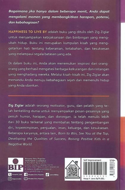 Happiness to Live By adalah buku yang ditulis mendiang Zig Ziglar untuk menyampaikan kebijaksanaan dan bimbingan yang mengubah hidup. Buku ini merupakan kumpulan kisah yang menggetarkan hati tentang keberanian, ketabahan, dan kesuksesan yang melampaui segala batasan yang ada.