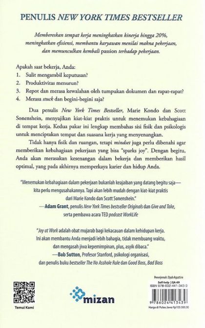 Dua penulis New York Times Bestseller, Marie Kondo dan Scott Sonenshein, menyajikan kiat-kiat praktis untuk menemukan kebahagiaan di tempat kerja. Kedua pakar ini lengkap membahas sisi fisik dan psikologis untuk menciptakan tempat dan suasana kerja yang menyenangkan.