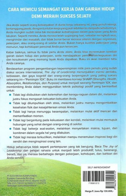 Cara Memicu Semangat Kerja dan Gairah Hidup demi Meraih Sukses Sejati! Jika Anda seperti orang kebanyakan di dunia kerja sekarang ini, yang penuh energi, bertanggung jawab, dengan tuntutan kerja yang jauh lebih keras dari sebelumnya, Anda mungkin sudah lama tak merasakan kebahagiaan dalam pekerjaan yang Anda lakukan. Seperti mereka, Anda merasa lelah sepanjang hari, sekadar mengikuti arus, menghindar dari masalah, dan tidak benar-benar merasa selaras dengan organisasi, pekerjaan, atau orang-orang di sekitar Anda. Dan bukan hanya kualitas pekerjaan Anda yang menurun, tapi juga kehidupan personal Anda pun menjadi terancam. Kabar baiknya, semua itu tidak perlu Anda alami. Anda bisa menemukan kembali gairah dalam hidup dan pekerjaan, serta mendapatkan pemenuhan/kepuasan diri dan kesuksesan yang memang layak Anda dapatkan. Buku ini akan memberi tahu Anda caranya. Hidup seharusnya tidak seperti pertempuran yang tak berujung. Baca The Joy of Leadership dan pelajari rahasia untuk menjadi lebih produktif, tulus, berenergi, terikat, dan ya, merasa bahagia dengan pekerjaan, kehidupan, dan bahkan diri Anda sendiri.