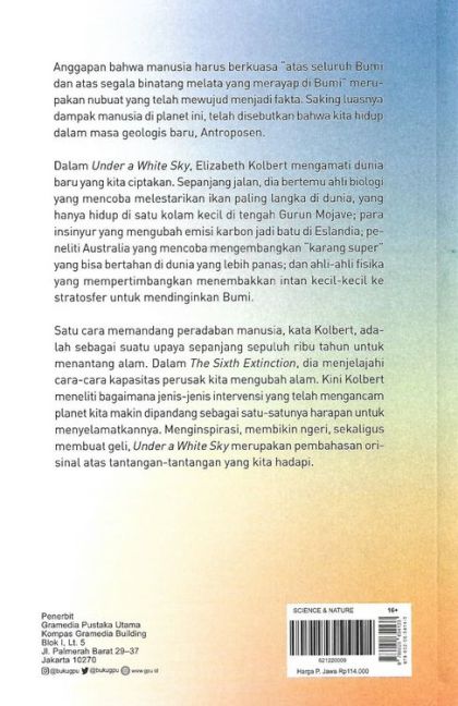 Dalam Under a White Sky, Elizabeth Kolbert mengamati dunia baru yang kita ciptakan. Sepanjang jalan, dia bertemu ahli biologi yang mencoba melestarikan ikan paling langka di dunia, yang hanya hidup di satu kolam kecil di tengah Gurun Mojave; para insinyur yang mengubah emisi karbon jadi batu di Eslandia; peneliti Australia yang mencoba mengembangkan -karang super-yang bisa bertahan di dunia yang lebih panas; dan ahli-ahli fisika yang mempertimbangkan menembakkan intan kecil-kecil ke stratosfer untuk mendinginkan Bumi.